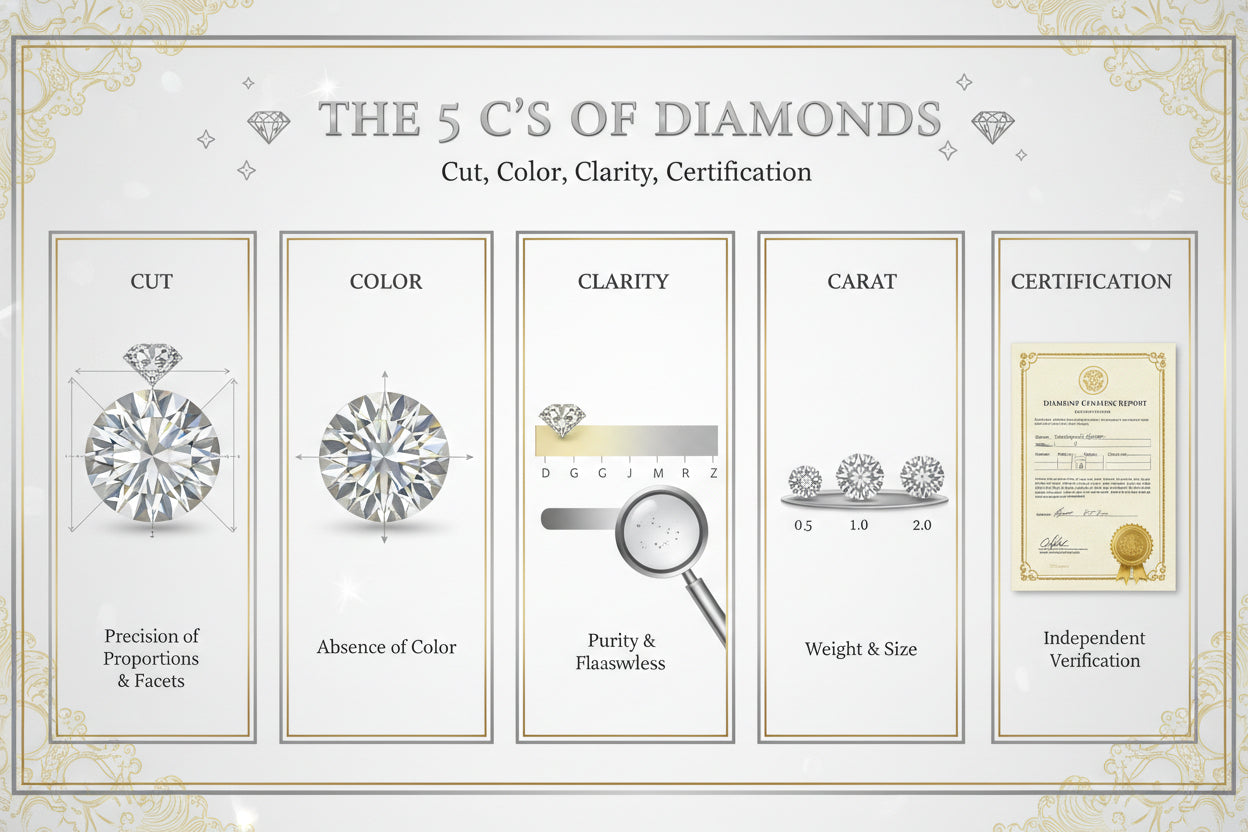 At Luxury Diamonds, our world-class service aims to educate our customers so that you can make an informed decision on the best diamond and setting style for you. We make sure to inform you on the 5 C’s of buying and choosing a diamond. Although most people are familiar with the 4 C’s of choosing a diamond (cut, color, clarity, and carat weight), we add an additional touch of luxury with the 5th C: caring.